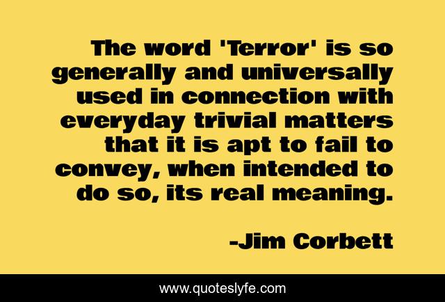 This page presents the quote "The word 'Terror' is so generally and universally used in connection with everyday trivial matters that it is apt to fail to convey, when intended to do so, its real meaning.". Author of this quote is Jim Corbett. This quote is about terror, fear, words,.