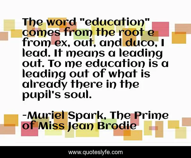 This page presents the quote "The word "education" comes from the root e from ex, out, and duco, I lead. It means a leading out. To me education is a leading out of what is already there in the pupil's soul.". Author of this quote is Muriel Spark, The Prime of Miss Jean Brodie. This quote is about teaching, education,.