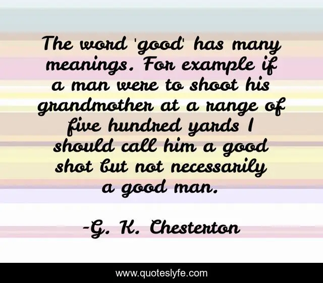 This page presents the quote "The word 'good' has many meanings. For example if a man were to shoot his grandmother at a range of five hundred yards I should call him a good shot but not necessarily a good man.". Author of this quote is G. K. Chesterton. This quote is about giving, goodness,.