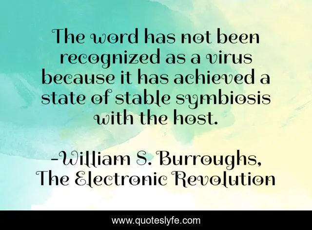This page presents the quote "The word has not been recognized as a virus because it has achieved a state of stable symbiosis with the host.". Author of this quote is William S. Burroughs, The Electronic Revolution. This quote is about word, language,.