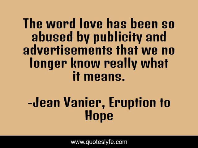 This page presents the quote "The word love has been so abused by publicity and advertisements that we no longer know really what it means.". Author of this quote is Jean Vanier, Eruption to Hope. This quote is about love, marketing, romance, passion, advertising, media, affection,.