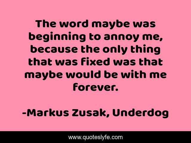 This page presents the quote "The word maybe was beginning to annoy me, because the only thing that was fixed was that maybe would be with me forever.". Author of this quote is Markus Zusak, Underdog. This quote is about maybe, forever, doubts,.
