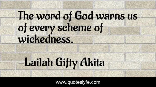 This page presents the quote "The word of God warns us of every scheme of wickedness.". Author of this quote is Lailah Gifty Akita. This quote is about christian, evil, wrong, word-of-god, self-help, wickedness,.