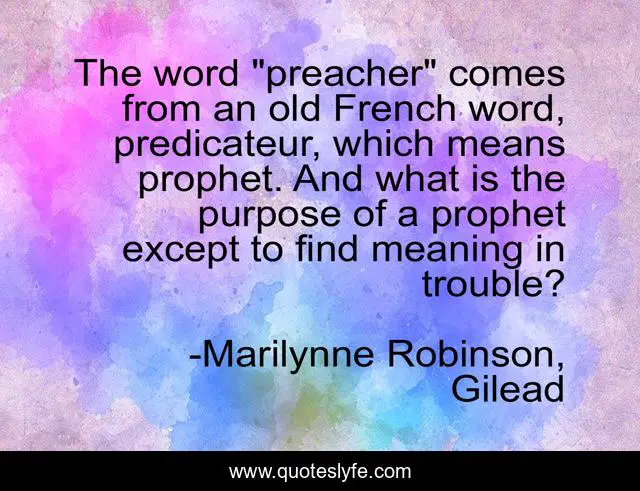 This page presents the quote "The word "preacher" comes from an old French word, predicateur, which means prophet. And what is the purpose of a prophet except to find meaning in trouble?". Author of this quote is Marilynne Robinson, Gilead. This quote is about prophet, meaning, trouble,.