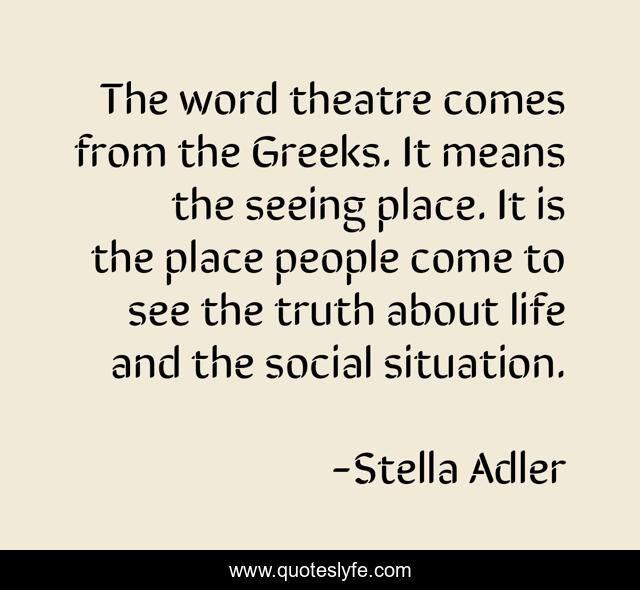This page presents the quote "The word theatre comes from the Greeks. It means the seeing place. It is the place people come to see the truth about life and the social situation.". Author of this quote is Stella Adler. This quote is about life, theatre, people,.