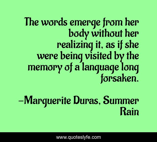 This page presents the quote "The words emerge from her body without her realizing it, as if she were being visited by the memory of a language long forsaken.". Author of this quote is Marguerite Duras, Summer Rain. This quote is about language, words,.