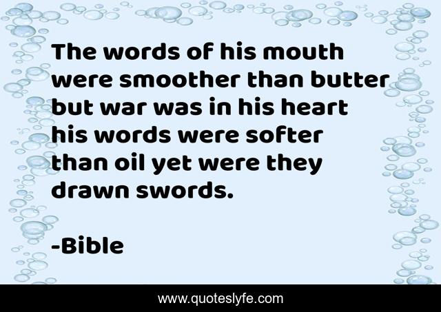 This page presents the quote "The words of his mouth were smoother than butter but war was in his heart his words were softer than oil yet were they drawn swords.". Author of this quote is Bible. .