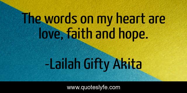 This page presents the quote "The words on my heart are love, faith and hope.". Author of this quote is Lailah Gifty Akita. This quote is about faith, lailah-gifty-akita-affirmations, love, affection, inspirational, enthusiasm, hope,.