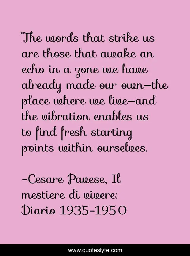 This page presents the quote "The words that strike us are those that awake an echo in a zone we have already made our own—the place where we live—and the vibration enables us to find fresh starting points within ourselves.". Author of this quote is Cesare Pavese, Il mestiere di vivere: Diario 1935-1950. This quote is about books, literature, reading, words,.