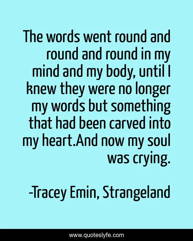 This page presents the quote "The words went round and round and round in my mind and my body, until I knew they were no longer my words but something that had been carved into my heart.And now my soul was crying.". Author of this quote is Tracey Emin, Strangeland. This quote is about body, heart, pain, depressed, soul, hurt, crying, heartbroken, depression,.