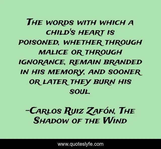 This page presents the quote "The words with which a child's heart is poisoned, whether through malice or through ignorance, remain branded in his memory, and sooner or later they burn his soul.". Author of this quote is Carlos Ruiz Zafón, The Shadow of the Wind. This quote is about criticism, child, verbal-abuse, words, memory,.