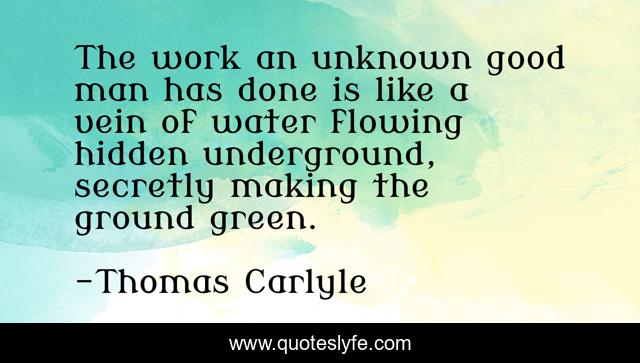 This page presents the quote "The work an unknown good man has done is like a vein of water flowing hidden underground, secretly making the ground green.". Author of this quote is Thomas Carlyle. This quote is about water, good, work,.