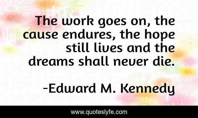 This page presents the quote "The work goes on, the cause endures, the hope still lives and the dreams shall never die.". Author of this quote is Edward M. Kennedy. This quote is about freedom, wisdom,.