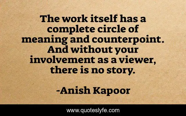 This page presents the quote "The work itself has a complete circle of meaning and counterpoint. And without your involvement as a viewer, there is no story.". Author of this quote is Anish Kapoor. This quote is about meaning, story, circle,.