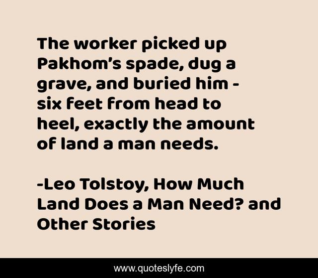 This page presents the quote "The worker picked up Pakhom’s spade, dug a grave, and buried him - six feet from head to heel, exactly the amount of land a man needs.". Author of this quote is Leo Tolstoy, How Much Land Does a Man Need? and Other Stories. This quote is about living, life, death, wealth, dying, poverty, life-and-death, greed,.