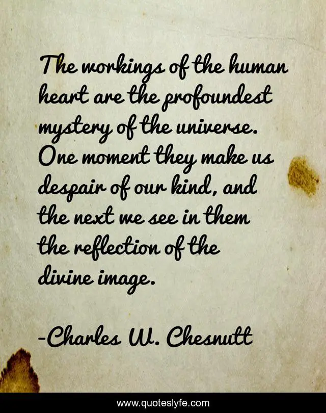 This page presents the quote "The workings of the human heart are the profoundest mystery of the universe. One moment they make us despair of our kind, and the next we see in them the reflection of the divine image.". Author of this quote is Charles W. Chesnutt. This quote is about divinity, humanity,.
