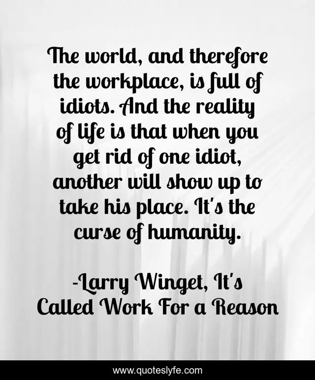 This page presents the quote "The world, and therefore the workplace, is full of idiots. And the reality of life is that when you get rid of one idiot, another will show up to take his place. It's the curse of humanity.". Author of this quote is Larry Winget, It's Called Work For a Reason. .