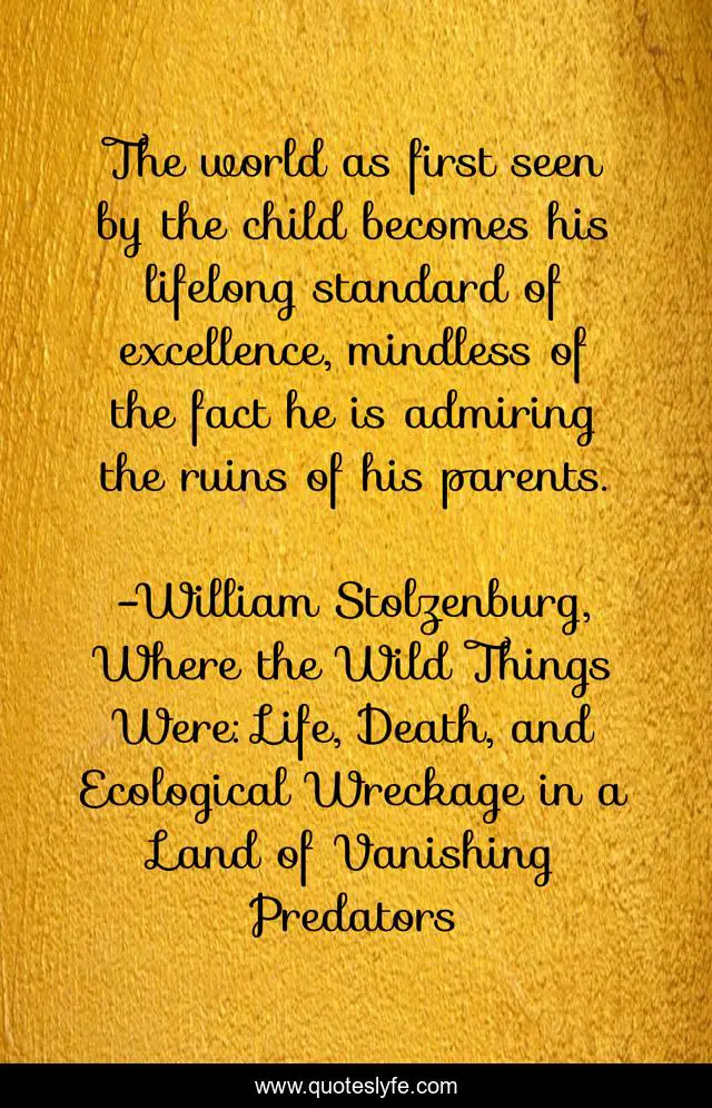 This page presents the quote "The world as first seen by the child becomes his lifelong standard of excellence, mindless of the fact he is admiring the ruins of his parents.". Author of this quote is William Stolzenburg, Where the Wild Things Were: Life, Death, and Ecological Wreckage in a Land of Vanishing Predators. This quote is about progress, ecology, parents, children, ruins,.
