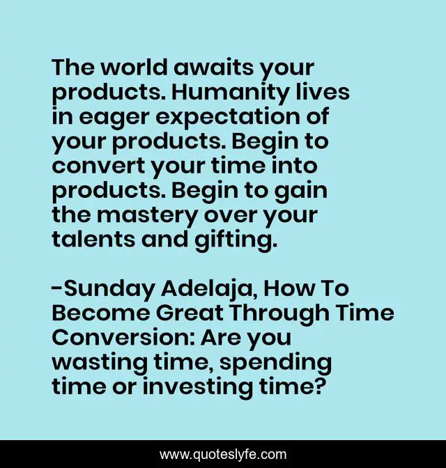 "Sunday Adelaja, How To Become Great Through Time Conversion: Are you wasting time, spending time or investing time? Quotes." Quoteslyfe.com, 2025. Sat. 06 Dec. 2025. <https://www.quoteslyfe.com/quote/The-world-awaits-your-products-Humanity-lives-39083>.