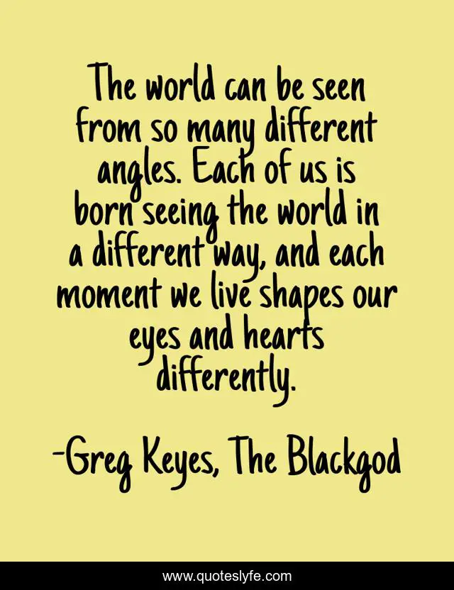 This page presents the quote "The world can be seen from so many different angles. Each of us is born seeing the world in a different way, and each moment we live shapes our eyes and hearts differently.". Author of this quote is Greg Keyes, The Blackgod. This quote is about perspective, different-paths,.