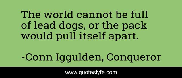 This page presents the quote "The world cannot be full of lead dogs, or the pack would pull itself apart.". Author of this quote is Conn Iggulden, Conqueror. This quote is about full, lead, cannot, world, pack, dogs, apart,.
