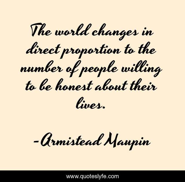 This page presents the quote "The world changes in direct proportion to the number of people willing to be honest about their lives.". Author of this quote is Armistead Maupin. This quote is about world, changes, people,.