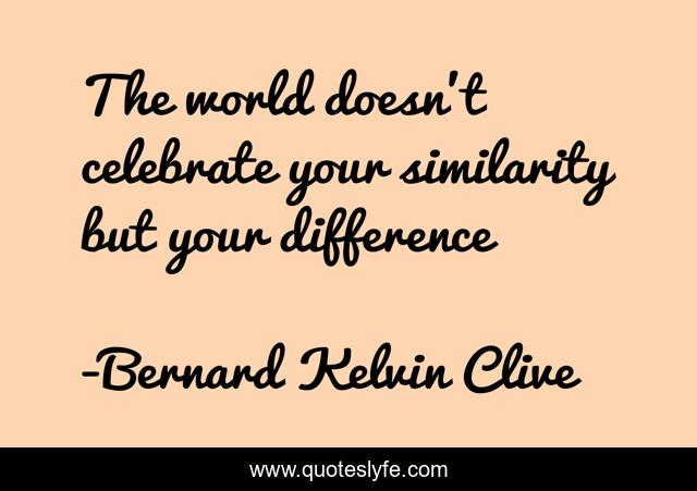 This page presents the quote "The world doesn't celebrate your similarity but your difference". Author of this quote is Bernard Kelvin Clive. This quote is about skills, branding, talents, uniqueness, differentiation, difference,.