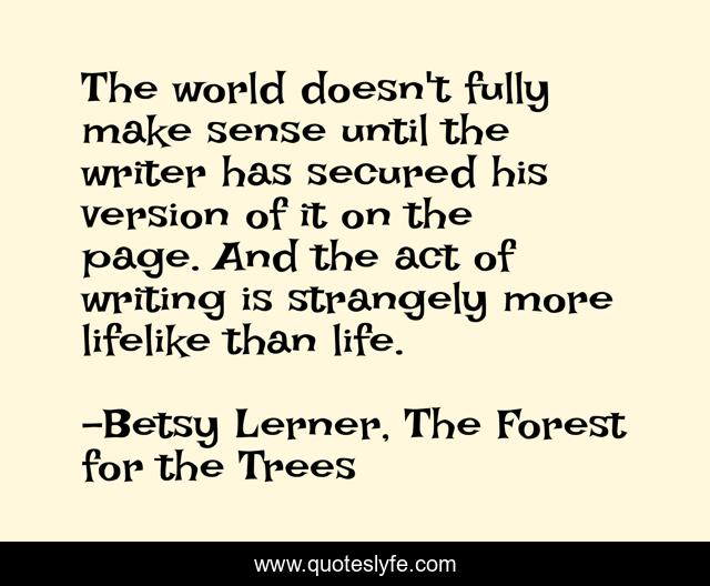 This page presents the quote "The world doesn't fully make sense until the writer has secured his version of it on the page. And the act of writing is strangely more lifelike than life.". Author of this quote is Betsy Lerner, The Forest for the Trees. .