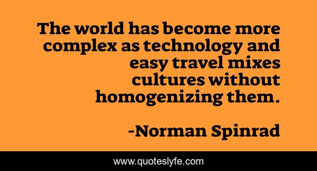 This page presents the quote "The world has become more complex as technology and easy travel mixes cultures without homogenizing them.". Author of this quote is Norman Spinrad. This quote is about world, technology, easy,.
