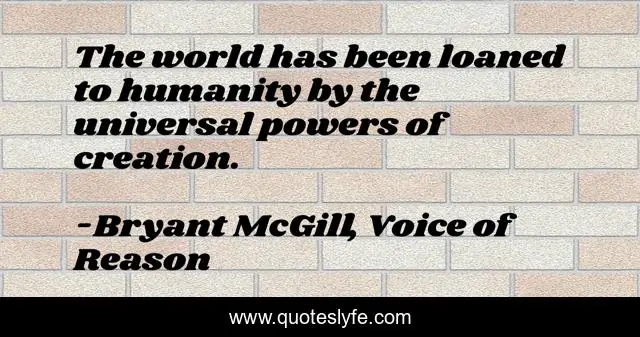 This page presents the quote "The world has been loaned to humanity by the universal powers of creation.". Author of this quote is Bryant McGill, Voice of Reason. This quote is about creation, god-s-power, humanity,.