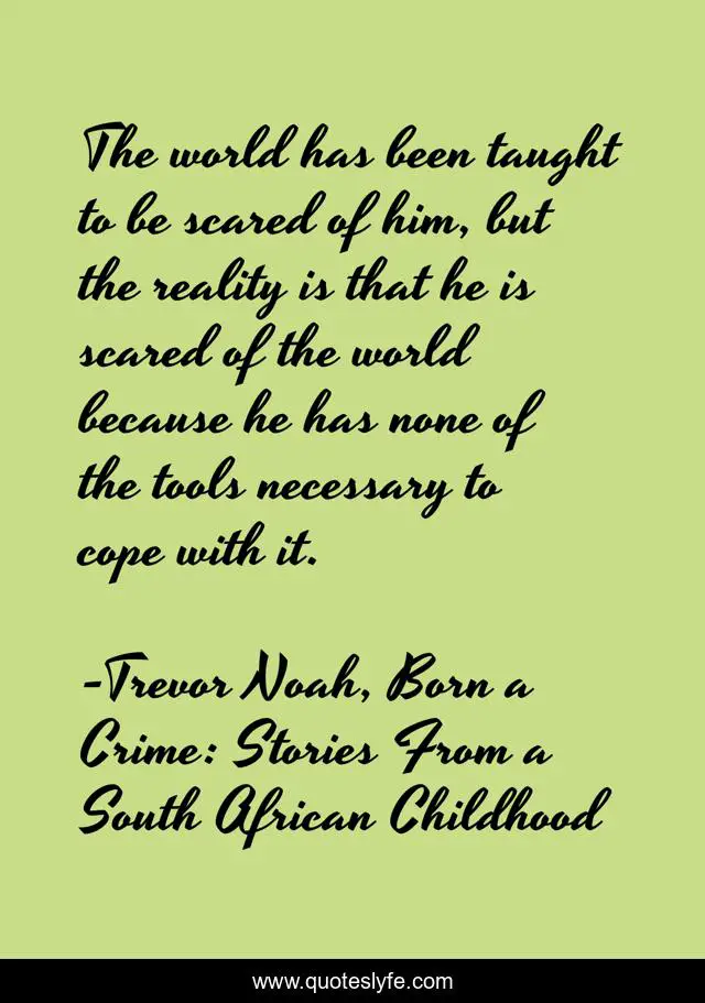 This page presents the quote "The world has been taught to be scared of him, but the reality is that he is scared of the world because he has none of the tools necessary to cope with it.". Author of this quote is Trevor Noah, Born a Crime: Stories From a South African Childhood. This quote is about apartheid, illiteracy, poverty, colonialism,.