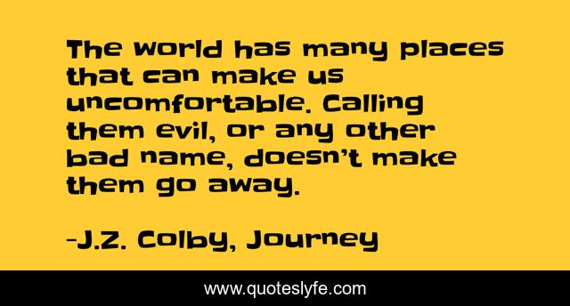 This page presents the quote "The world has many places that can make us uncomfortable. Calling them evil, or any other bad name, doesn’t make them go away.". Author of this quote is J.Z. Colby, Journey. This quote is about nebador, evil, uncomfortable,.