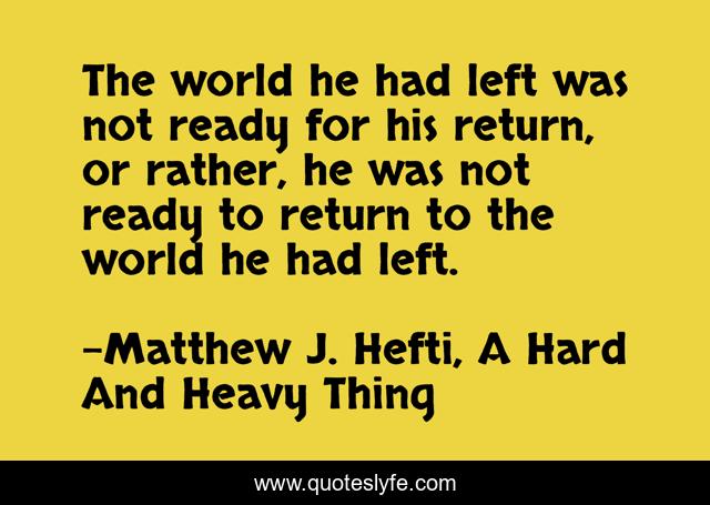This page presents the quote "The world he had left was not ready for his return, or rather, he was not ready to return to the world he had left.". Author of this quote is Matthew J. Hefti, A Hard And Heavy Thing. This quote is about love, regret, relationship, hurt, romance, soldier, guilt, homecoming, deployment,.