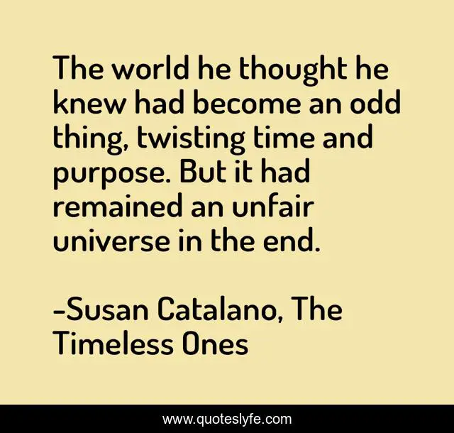 This page presents the quote "The world he thought he knew had become an odd thing, twisting time and purpose. But it had remained an unfair universe in the end.". Author of this quote is Susan Catalano, The Timeless Ones. This quote is about salem, salem-witch-trials, witches, time-travel,.