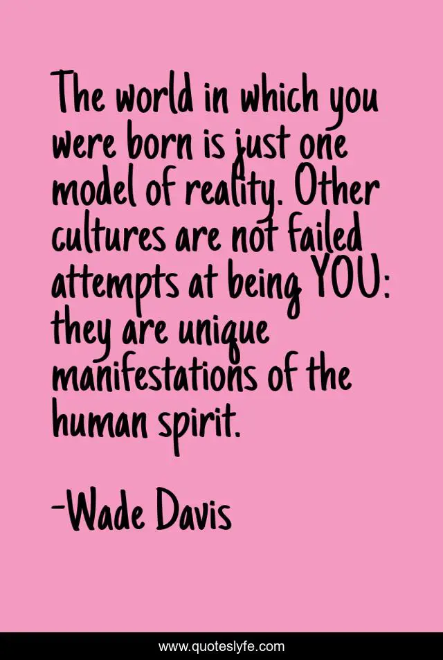 This page presents the quote "The world in which you were born is just one model of reality. Other cultures are not failed attempts at being YOU: they are unique manifestations of the human spirit.". Author of this quote is Wade Davis. This quote is about culture, human-spirit, diversity,.