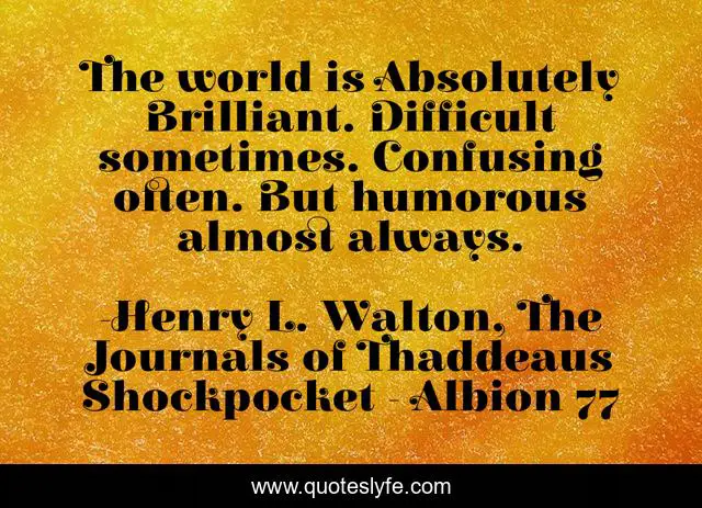 This page presents the quote "The world is Absolutely Brilliant. Difficult sometimes. Confusing often. But humorous almost always.". Author of this quote is Henry L. Walton, The Journals of Thaddeaus Shockpocket - Albion 77. This quote is about fantasy, childrens-books, historical-fantasy, humor,.