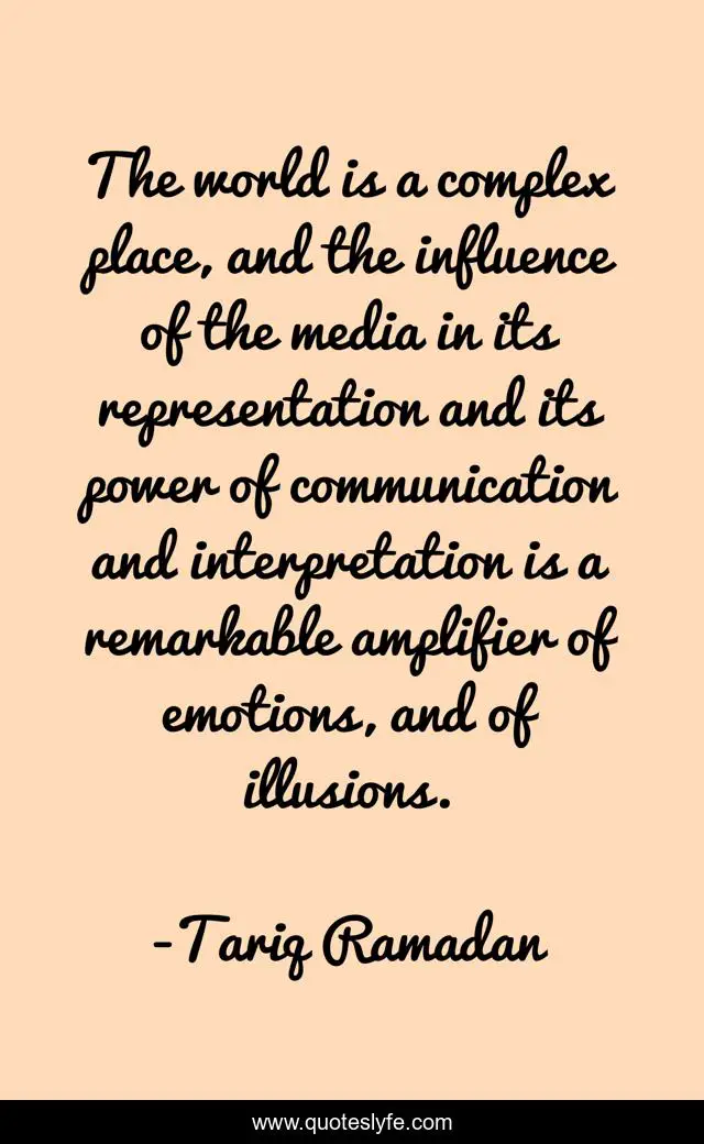 This page presents the quote "The world is a complex place, and the influence of the media in its representation and its power of communication and interpretation is a remarkable amplifier of emotions, and of illusions.". Author of this quote is Tariq Ramadan. This quote is about world, influence, power,.