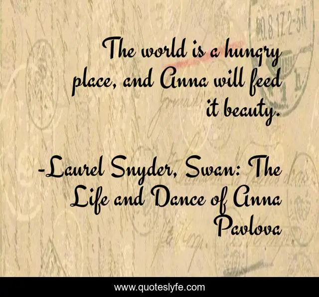 This page presents the quote "The world is a hungry place, and Anna will feed it beauty.". Author of this quote is Laurel Snyder, Swan: The Life and Dance of Anna Pavlova. This quote is about dance, picture-book, beauty,.