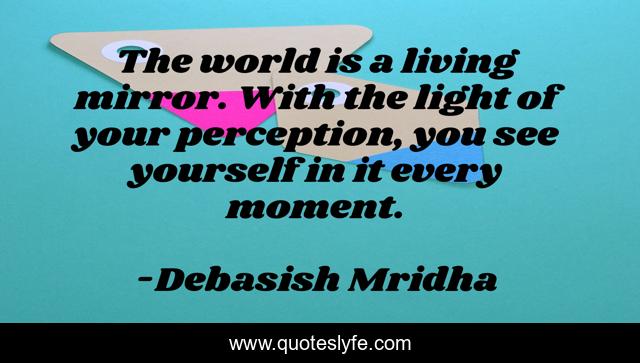 This page presents the quote "The world is a living mirror. With the light of your perception, you see yourself in it every moment.". Author of this quote is Debasish Mridha. This quote is about perception, quotes, philosophy, debasish-mridha, the-world-is-a-living-mirror, see-yourself, debasish-mridha-md, inspirational, enthusiasm,.