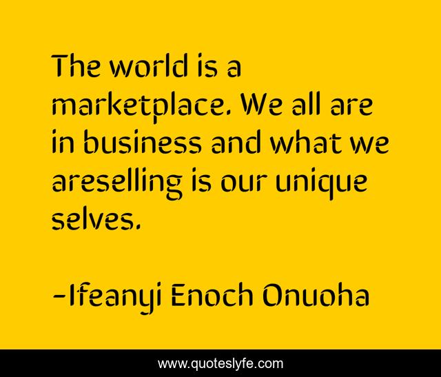 This page presents the quote "The world is a marketplace. We all are in business and what we areselling is our unique selves.". Author of this quote is Ifeanyi Enoch Onuoha. This quote is about business, uniqueness, sales, ifeanyi-enoch-onuoha, edge, selling-point,.