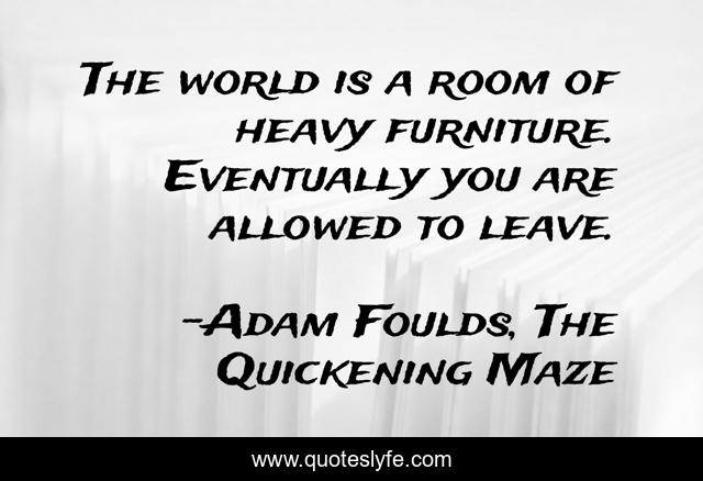 This page presents the quote "The world is a room of heavy furniture. Eventually you are allowed to leave.". Author of this quote is Adam Foulds, The Quickening Maze. This quote is about freedom, life, metaphor,.