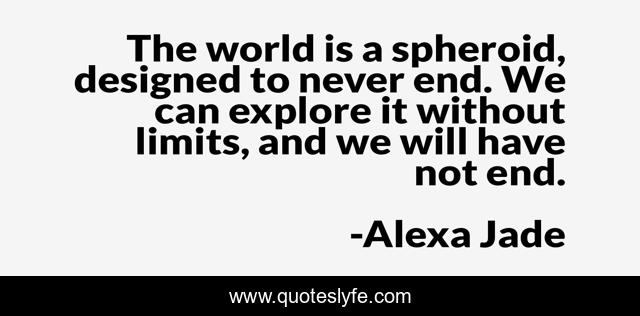 This page presents the quote "The world is a spheroid, designed to never end. We can explore it without limits, and we will have not end.". Author of this quote is Alexa Jade. This quote is about inspirational-life, science, explore, inducted, world,.