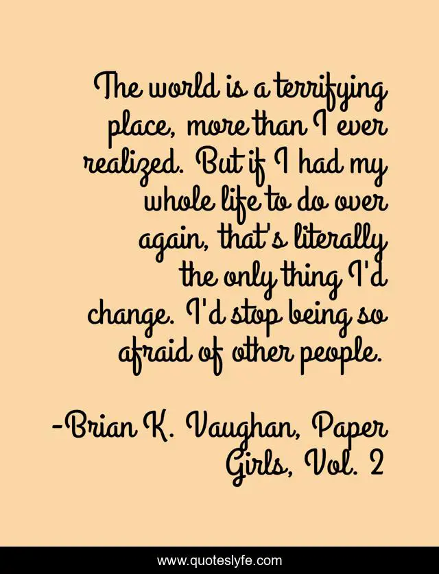 "Brian K. Vaughan, Paper Girls, Vol. 2 Quotes." Quoteslyfe.com, 2025. Mon. 08 Dec. 2025. <https://www.quoteslyfe.com/quote/The-world-is-a-terrifying-place-more-47277>.