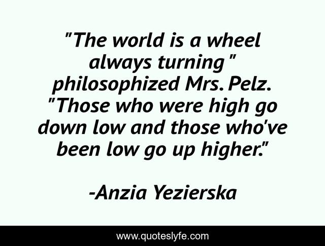 This page presents the quote ""The world is a wheel always turning " philosophized Mrs. Pelz. "Those who were high go down low and those who've been low go up higher."". Author of this quote is Anzia Yezierska. .