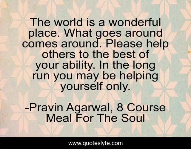 This page presents the quote "The world is a wonderful place. What goes around comes around. Please help others to the best of your ability. In the long run you may be helping yourself only.". Author of this quote is Pravin Agarwal, 8 Course Meal For The Soul. This quote is about 8-course-meal-for-the-soul, world, helping-others,.