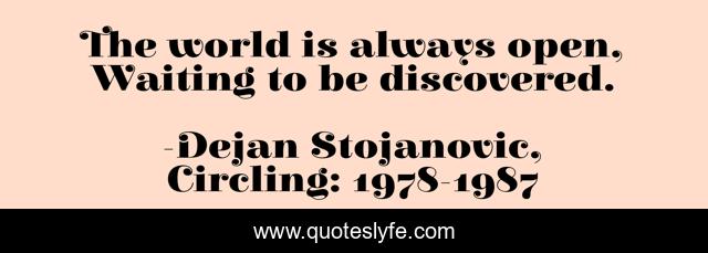 This page presents the quote "The world is always open, Waiting to be discovered.". Author of this quote is Dejan Stojanovic, Circling: 1978-1987. This quote is about literature, dejan-stojanovic, poetry, wisdom, quotes, waiting, circling, quotes-to-live-by, world,.