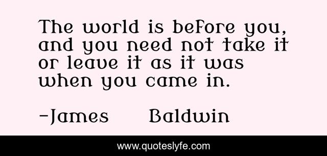 This page presents the quote "The world is before you, and you need not take it or leave it as it was when you came in.". Author of this quote is James Baldwin. This quote is about individuality, inspirational, life, courage, life-lessons, enthusiasm,.