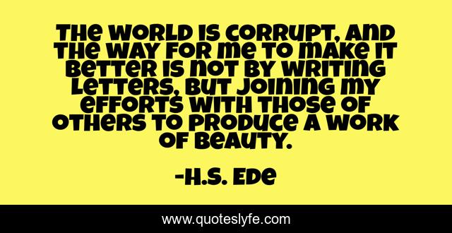 This page presents the quote "The world is corrupt, and the way for me to make it better is not by writing letters, but joining my efforts with those of others to produce a work of beauty.". Author of this quote is H.S. Ede. This quote is about effort, passion, beauty,.
