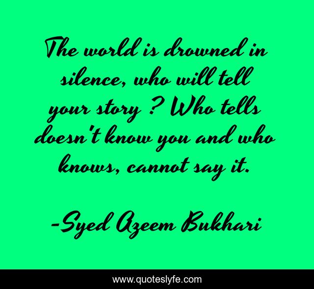 This page presents the quote "The world is drowned in silence, who will tell your story ? Who tells doesn't know you and who knows, cannot say it.". Author of this quote is Syed Azeem Bukhari. This quote is about story, drown, silence,.
