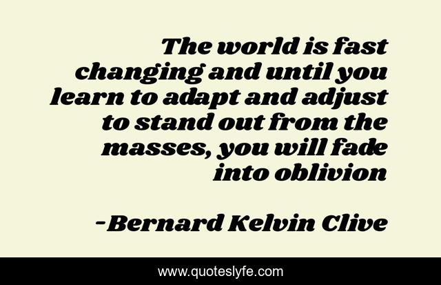 This page presents the quote "The world is fast changing and until you learn to adapt and adjust to stand out from the masses, you will fade into oblivion". Author of this quote is Bernard Kelvin Clive. This quote is about rebrand, personal-branding, rebranding, branding, technology, change,.